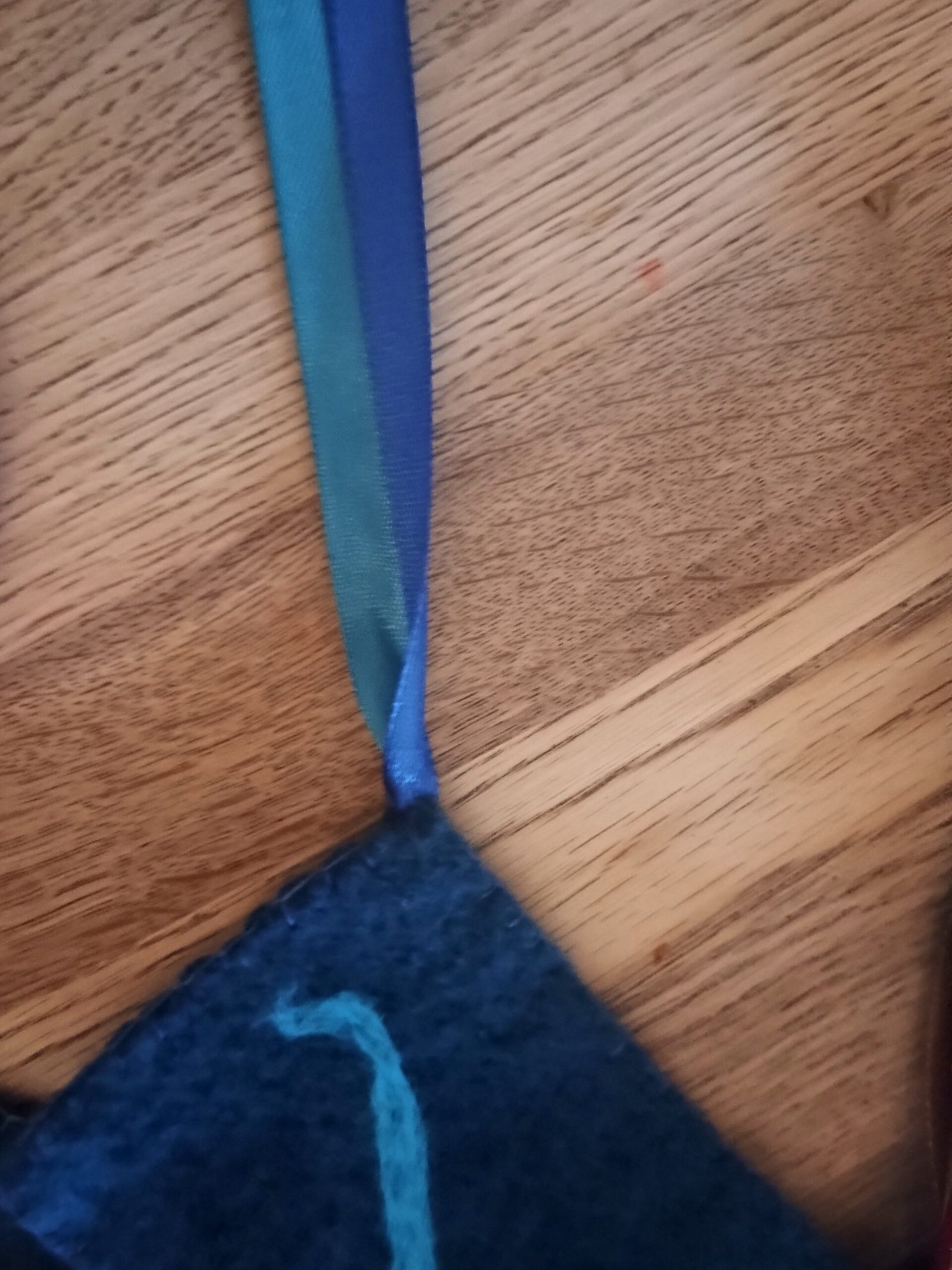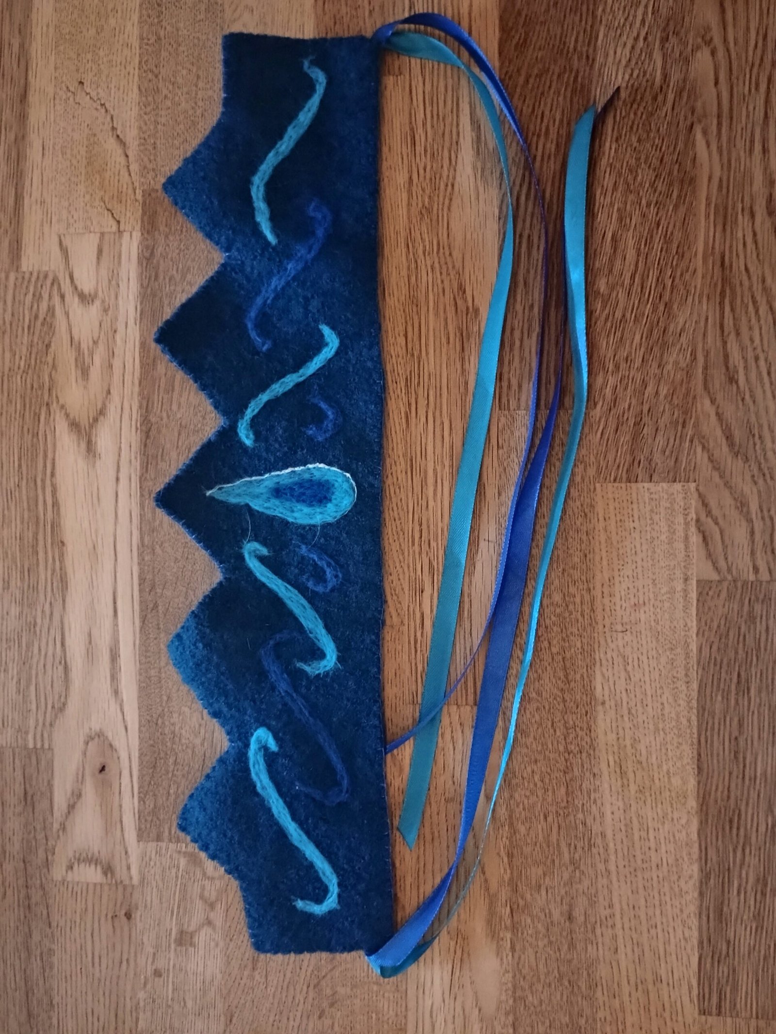Deze handgemaakte vilten kroon is gemaakt van gekookte wol in diepe petrol- en blauwtinten en versierd met vloeiende lijnen en een druppelvormig accent van lontwol.